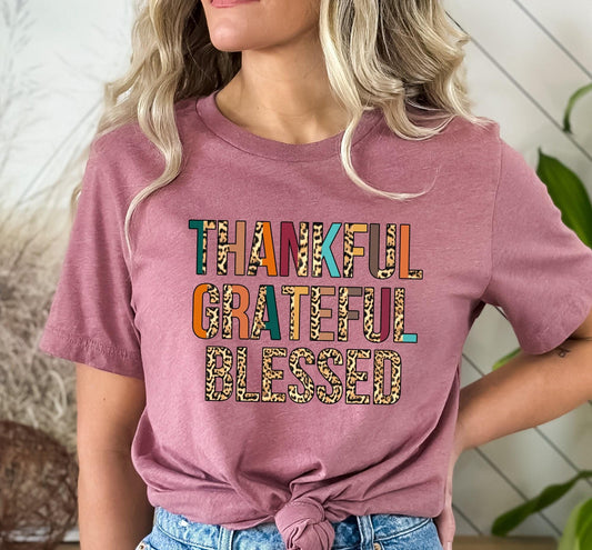 Thankful Grateful Blessed Leopard Print Letter Saying Graphic T-Shirt