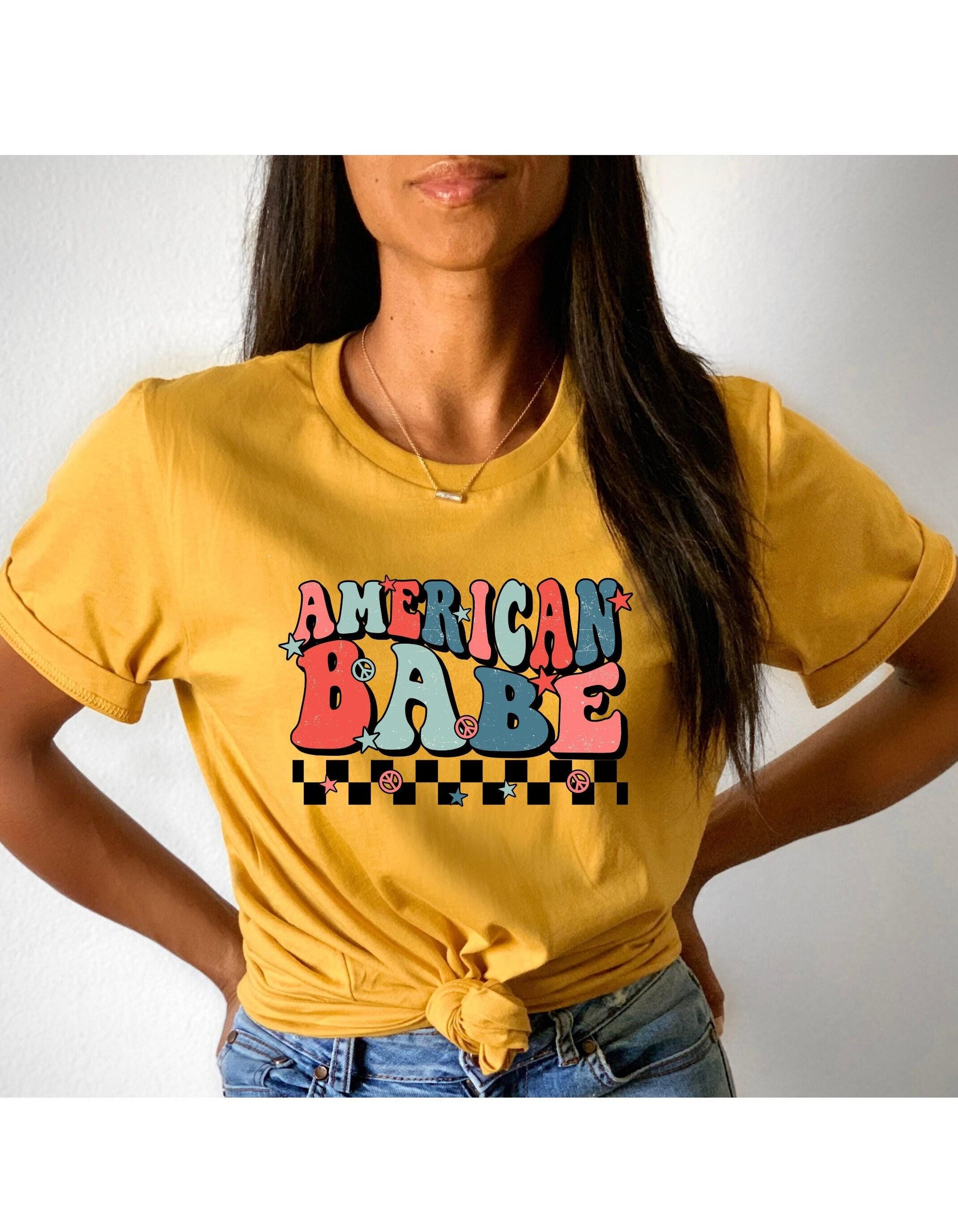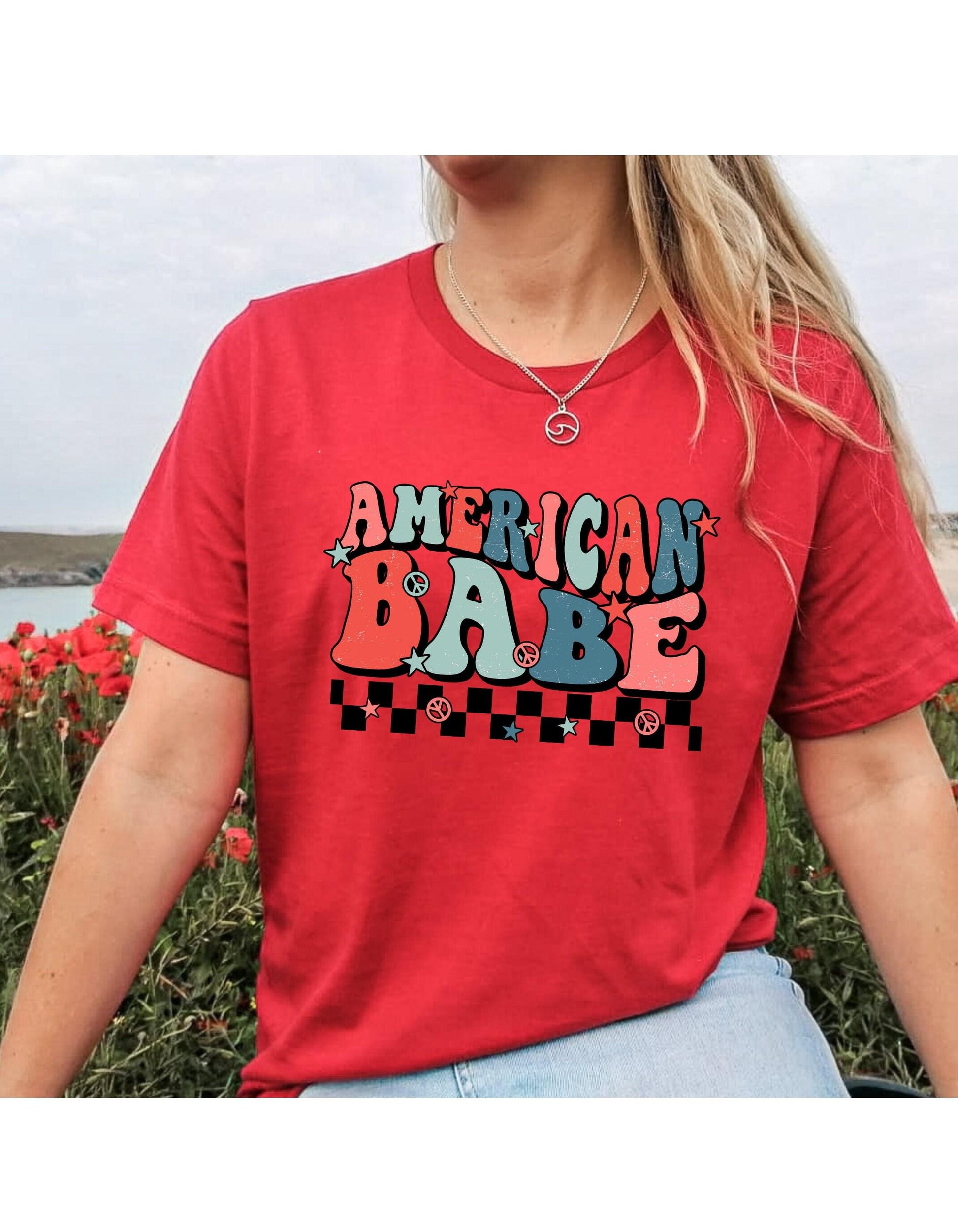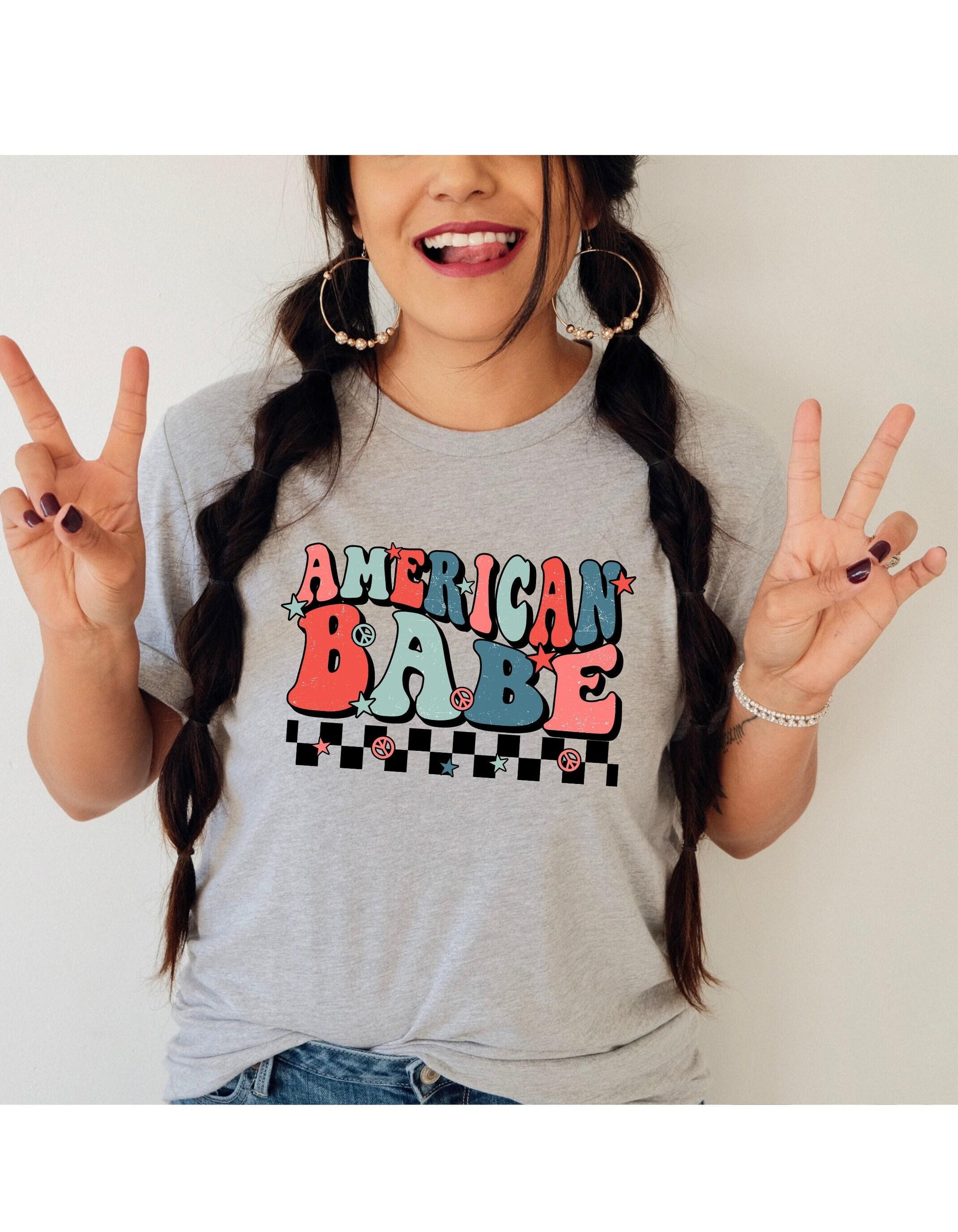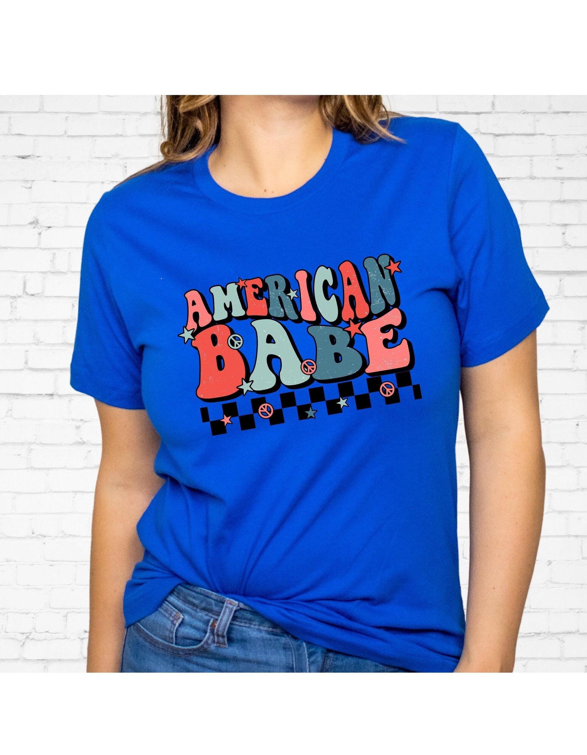 American Babe Peace Sign Checkerboard July 4th Graphic T-Shirt